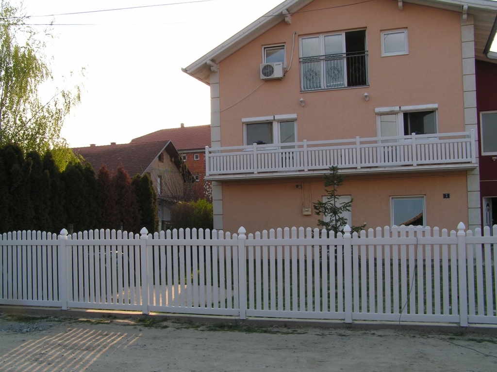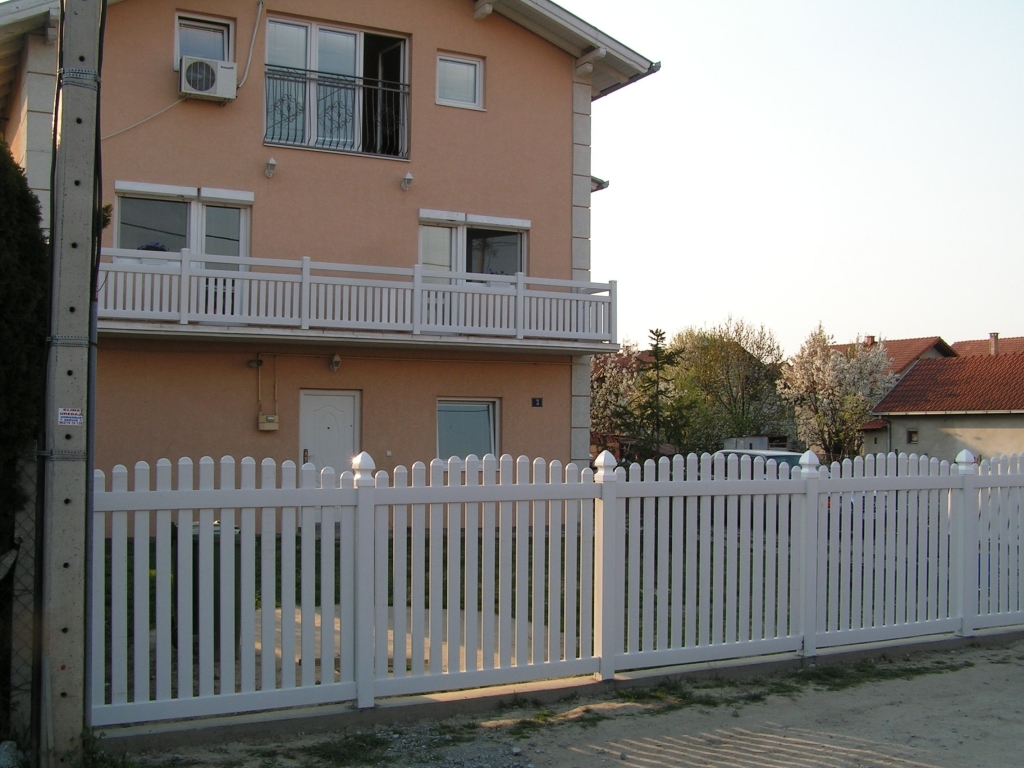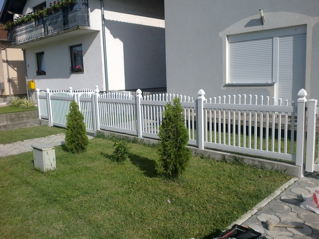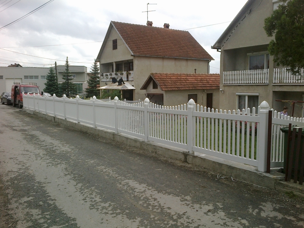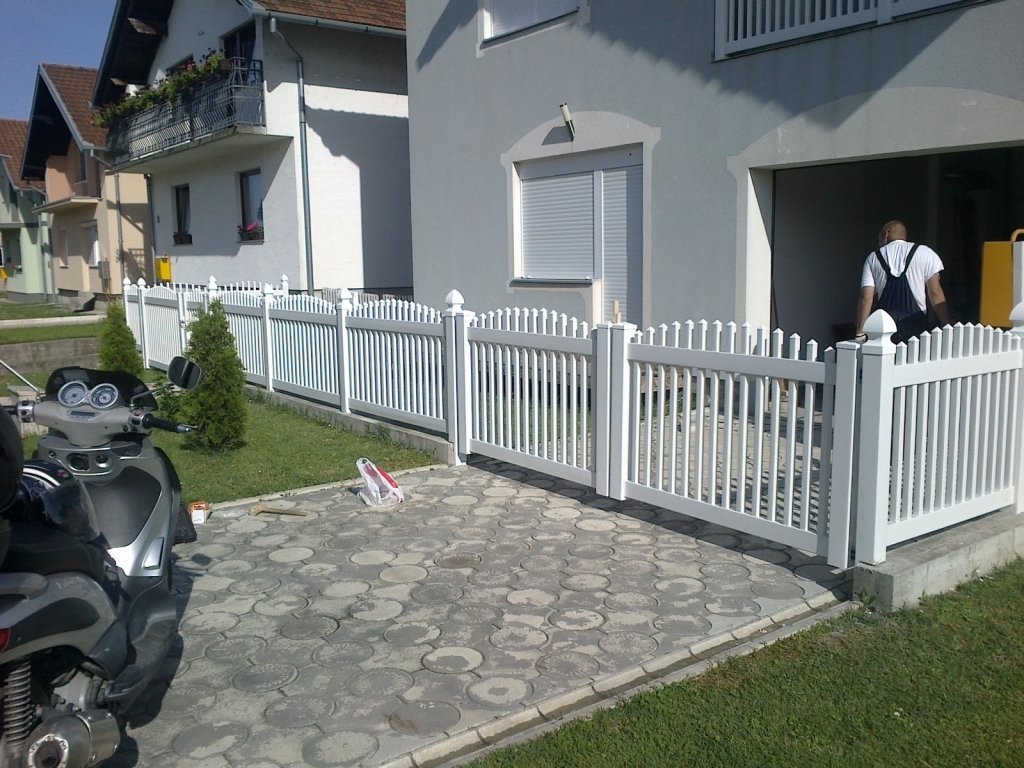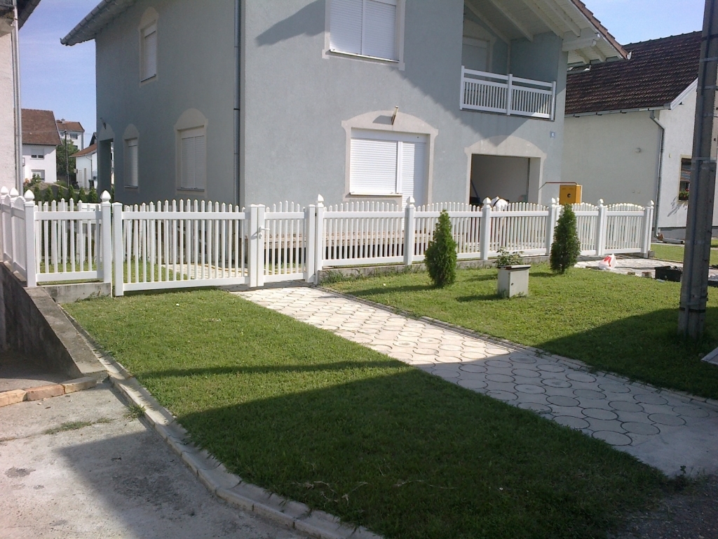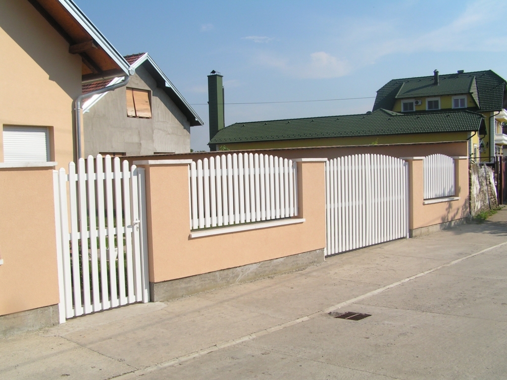 Ravna plastična ograda do ulice, sa malom i velikom kapijom.